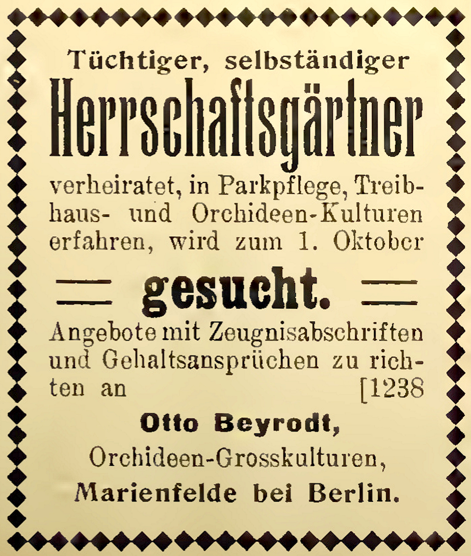 | 400 | 1912AHM  1907 - Gärtnerei für Orchideenzucht Otto Beyrodt, Berliner Straße 125-127 - Suchanzeige für einen "Herrschaftsgärtner"