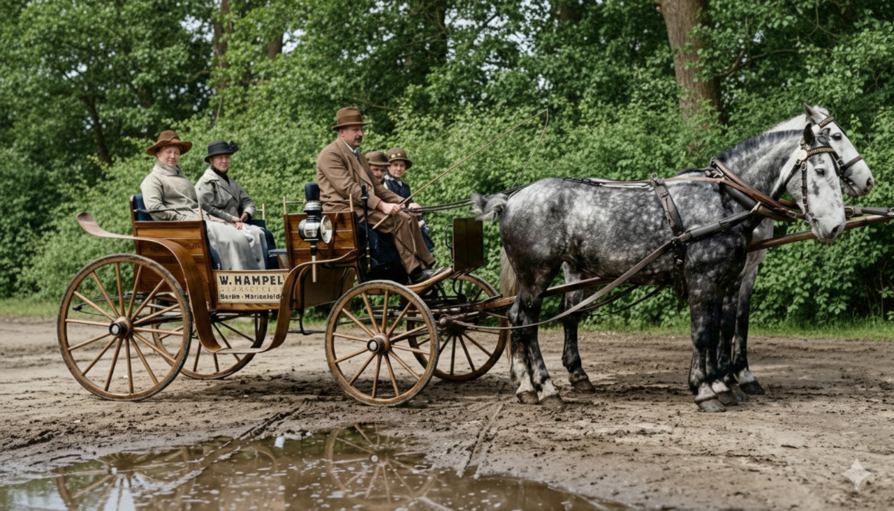 Herr Hampel chauffiert seine Familie in einer zweispännigen Kutsche. Quelle: Archiv "Arbeitskreis Historisches Marienfelde" Kategorie 1: Handel und Gewerbe Kategorie 2: Baumschule Bilddatei: 1920_fam-hampel-03-HamB1Gemini_Generated aktualisiert: 2026-01-22 |