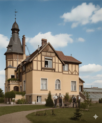 Das Haus wurde 1895 gebaut. Über der Einfahrt befindet sich eine Art Wappen, das ein "Hirschgeweih" darstellt.
